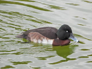 | 特徴 | まれな冬鳥として各地で記録があります。雄の生殖(夏)羽では頭部が緑色光沢のある黒色をしており,虹彩が白色です。雌は頭部も黒色で虹彩は黒色です。本種の嘴爪は小さく,広がらない傾向があります。近年,世界的に分布を東に拡げているメジロガモとの交雑が進み,世界的な希少種になっています。国内でもメジロガモやホシハジロなどとの雑種が観察される機会が増えてきました。 |