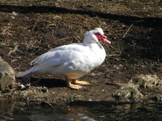 | 特徴 | 本来は中南米に生息するノバリケンを食用目的で家禽化したもの。写真のように全身が白色のもの,灰色のもの,緑色がかった黒色のものの3タイプの体色があり,これらが混じりあっていることもしばしばです。目の周辺には羽毛の無い裸出部があり,赤色です。本種とアヒルを交雑したものがドバンです。 |