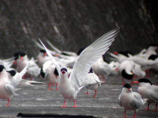 | 特徴 | 夏鳥として奄美大島以南の海岸に渡来するほか,本州以南でもまれに記録されます。日本産アジサシ類では中型の種です。和名の通り,嘴と脚(足)は濃い紅色,頭部は黒色であとは全身が白色です。尾羽は長くて,たたんだときには風切より明瞭に突出し,黒色部がないことも特徴です。エリグロアジサシと行動を共にするのをよく見かけます。 |
