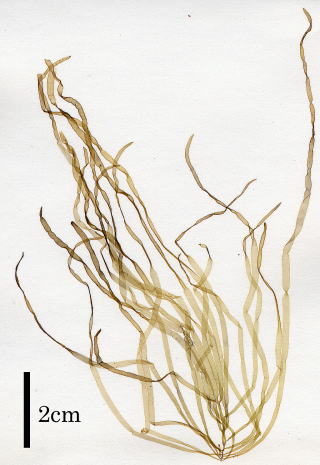 小〜中型のアオノリ類。基部付近から徐々に幅が広くなります。分枝は見られません。