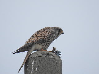 | 日本産の亜種 | 日本で繁殖するものは亜種チョウゲンボウ interstinctus とされています。ほかに大陸性の別亜種チョウセンチョウゲンボウ perpallidus の観察記録もあります。チョウセンチョウゲンボウは雌雄ともに著しく淡色です。近年基亜種ヨーロッパチョウゲンボウと思われる記録もあります 。 |