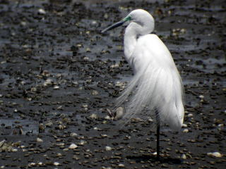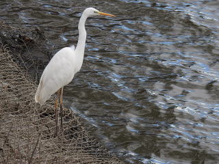 | 特徴 | シラサギとして徳島県の県鳥。ふつうは亜種チュウダイサギで,まれな冬鳥として亜種ダイサギ(オオダイサギ)が渡来します。淡水,海水を問わず,“水辺”ではよく見られます。日本産シラサギ類では最大の種で,夏羽では嘴が黒く,目先は緑色,冬羽では嘴全体が黄色です。他のシラサギ類と混群を作ることもあり,識別が紛らわしいこともありますが,大きさ,頸の長さ,目先や嘴の色,口角が眼の後方を越えること,などで識別します。蹼(みずかき)は黒色です。 |