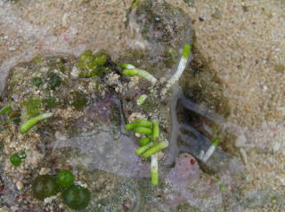 | コメント | 長さ1〜3cm程度の棍棒状をした海藻。下部は石灰質を沈着し,白くがさがさした手触りです。ルーペなどで拡大してみると,輪生する枝が何層にも重なっている様子がわかります。 |