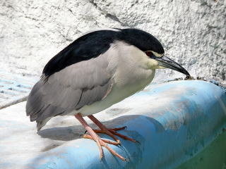 | 特徴 | 主に本州以南で留鳥として見られますが,沖縄などでは冬鳥です。さほど小型ではないものの,たいていは頸を縮めており,丸みのある体形です。成鳥は短い冠羽があり,飛翔時は翼上面の灰色みが目立ちます。幼鳥は茶褐色の翼に白い斑が散在するので「ホシゴイ」と呼ばれています。夜行性で「クヮッ」と鳴きながら飛ぶため,「夜ガラス」と呼ばれることもあります。変わった和名ですが,昔,醍醐天皇が本種に舞い降りるよう命じた時,素直に応じたことに感激した結果,五位の位を授けたところ,その嬉しさに本種が「鷺舞」を披露したという故事によるものです(平家物語)。 |