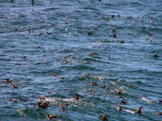 | 特徴 | オーストラリア南部やタスマニア島周辺で繁殖し,夏場は大きな群れとなって餌のオキアミ類を求め,北太平洋まで回遊します。初夏にはしばし陸からも群れが観察できます。日本産ミズナギドリでは中型です。全身が黒褐色ですが,まれに翼下面に灰色部を持つ個体もいます。和名ほど嘴は細い印象がなく,むしろ短めに見えます。 |