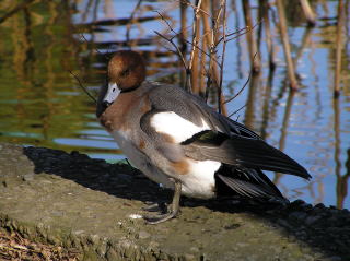 | 特徴 | 冬鳥として全国の河川,湖沼,海上に飛来します。雄生殖(=夏)羽の頭部は緋色で,“モヒカン”状にクリーム色の頭央線が入ります。雌は地味でアメリカヒドリに酷似しますが,全体に赤みがかり,濃色とされています。野外でしばしばアメリカヒドリとの雑種が見られ,その場合は頭部に緑の模様が入ります。翼鏡は緑色です。雌雄とも嘴のほとんどが青灰色で短く,慣れればシルエットでも本種と判別することが可能です。ピューンと口笛のような声で鳴きます。 |