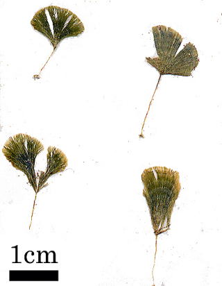 | コメント | 石灰質を少しかぶり,全体の手触りは少しがさがさします。小型の海藻で,採集には注意が必要です。付着器から1本の柄が伸び,その先は扇状に広がります。 |