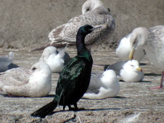 | 特徴 | 和名の通り日本産のウでは最小の種で,一緒に見られることの多いウミウと比べると大きさの差は顕著です。東北地方〜千島沿岸で繁殖し,九州以北では冬に見られます。嘴を含めた全身が黒く(夏羽では嘴の付け根が濃い赤色になりますが,順光でないと目立ちません),首が短く,細身の体なので,かなりすらっとした印象を受けます。さらにカワウやウミウに見られる嘴付け根の白い部分はありません。 |