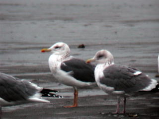 | 写真のデータ | (左)成鳥冬羽:熊本県八代市 2009年1月31日 (右)成鳥冬羽:熊本県八代市 2007年1月21日 ※右の写真中,右の個体はセグロカモメです。脚や背の色,嘴の斑の違いにご注目下さい。 |