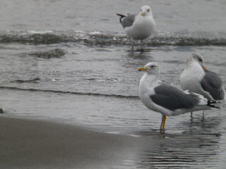 | 特徴 | まれな冬鳥として主に九州以北の沿岸でみられます。九州ではやや個体数の多い傾向があります。セグロカモメと同大かやや小さく,背の色もセグロカモメよりは濃い傾向があります。脚(足)は山吹色です。また,嘴の赤い斑は横長に大きくなる傾向があり,しばしば上嘴にかかります。日本産鳥類目録第7版では亜種扱いですが,本種をニシセグロカモメに内包せず,独立種ホイグリンカモメとする考え方もあります。 |