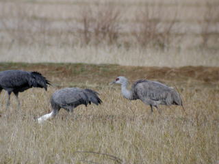 | 特徴 | 冬鳥として鹿児島県出水市に数羽が渡来する以外は迷鳥または旅鳥です。日本産ツル類では小型の種で,全身が灰色であることが特徴です。右の写真のように,茶褐色の羽が混じることがありますが,繁殖地で塗布した鉄分の多く含まれる土による発色だそうです。近年では出水市以外でも記録されることが多くなった気がします。 |
