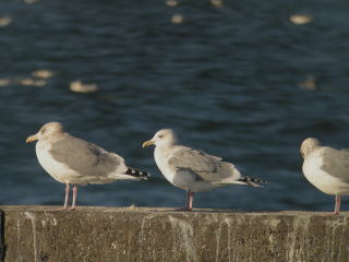 | 特徴 | 数少ない冬鳥として本州以北から記録があります。千葉県銚子市では1987年以降,数羽が越冬しています。大型のカモメで,背の色はセグロカモメのそれより淡い灰色です。ただし,逆光下や曇天時は濃く見えることもあります。短い脚(足)の赤みは強く,サーモンピンクに見えます。翼下面は淡く,黒色部はほとんどありません。意外に識別が難しいカモメ類です。カモメ類は個体差が大きいため,いくつかの特徴をふまえて識別することを薦めます。 |