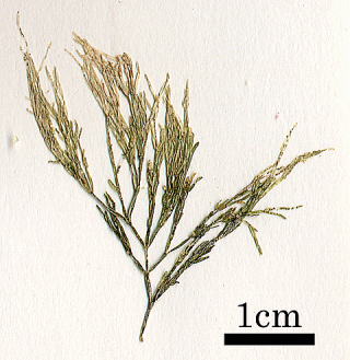| コメント | この仲間では細胞壁が最も厚く(0.2mm以上),マツの葉のような手触りです。藻体は叢状になっていますが,解いていくと一見,シオグサ類のようにも見えます。 |