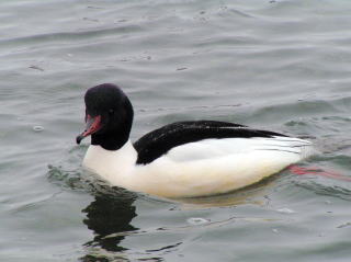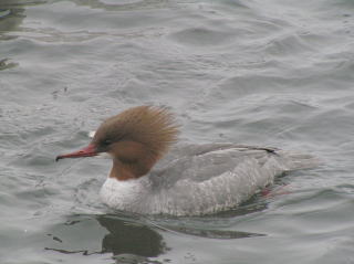 | 特徴 | 冬鳥として主に九州以北で見られます。北海道では一部が繁殖します。内陸の湖沼や河川で見られますが,沿岸にいることもあります。アイサ類で最大の種ですが,水に浮いているときは意外に小さく見えます。雄の生殖(夏)羽は頭部および翼上面が深緑色で,腹部はピンク色がかった白色であることが特徴です。雌の生殖羽は頭部が茶色,後頭部には冠羽が著しいです。雄のエクリプス(非繁殖羽)は雌に似ますが,後頭部に冠羽はありません。 |