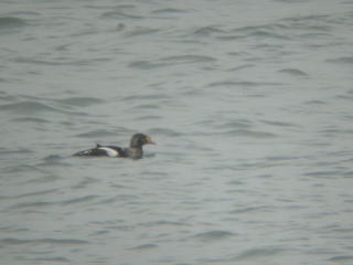 | 特徴 | 本来は北極海沿岸で繁殖し,冬期はアリューシャン列島などへ渡ります。きわめてまれな冬鳥として北海道の沿岸で数回の記録があります。雄の生殖(夏)羽は頭部が灰色,嘴が赤色,額がオレンジ色,頬が緑色と派手な顔をもち,体は黒色で胸と上背,雨覆,腰が白色です。雌は嘴が黒く,全身茶褐色で黒斑が入る地味な体色です。雌雄とも頸が太く見えます。雄のエクリプス(非生殖羽)は雄に似ていますが,全体が暗色です。繁殖の際羽毛で巣をかけますが,これがダウンの材料になるので,この名が付きました。 |