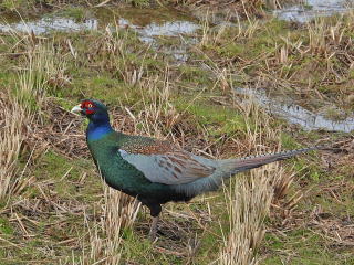 | 特徴 | 日本の国鳥。岩手県の県鳥。本州から九州にかけて,留鳥として農耕地などに棲息しています。雄は大きな肉垂をもち,独特な顔つきをしています。体は青紫色の頸を除き,全体が緑色,翼は小・中雨覆が青灰色,肩羽が黄色や黒のU字型の模様を伴う茶色です。尾羽は長く,黒色の縞模様が入るほか,縁は桃色がかっています。雌は全体的に黄色みがかった茶色でところどころに黒色斑が入ります。顔に目立つ肉垂はありません。 |