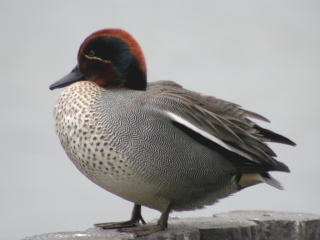 | 日本産の亜種 | 日本産のものは亜種コガモ crecca とされています。まれに北米産の別亜種アメリカコガモ carolinensis が飛来しますが,亜種コガモの雄は白線が縦方向(見た目には横方向)なのに対して,アメリカコガモでは横方向(同,縦方向)で,全体的に暗色です。雌の両亜種の区別は野外では困難ですが,アメリカコガモはより頬線が目立つ傾向があります。また,三列風切の最も外側の羽では羽縁の黒色部が先端のほうまで及びます。 |