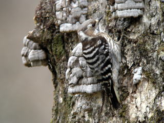 | 日本産の亜種 | いずれも留鳥である9亜種が知られており,南方のものほど暗色になり,白線の幅も細くなる傾向があります。北海道には亜種エゾコゲラseebohmi が,本州の滋賀,福井,京都以東には亜種コゲラ nippon が,伊豆諸島と屋久島には亜種ミヤケコゲラ matsudairai が,本州西部と四国には亜種シコクコゲラ shikokuensis が,九州には亜種キュウシュウコゲラ kizuki が,隠岐と対馬には亜種ツシマコゲラ kotataki が,奄美諸島には亜種アマミコゲラ amamii が,沖縄本島と屋我地島には亜種リュウキュウコゲラ nigrescens が,西表島には亜種オリイコゲラ orii が分布します。 |