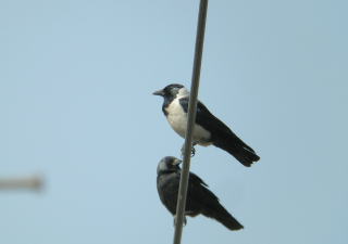 | 特徴 | 冬鳥として九州および日本海側で見られますが,近年は北海道や関東,東北にも渡来します。ミヤマガラスの群れに混じっていることが多く,本種のみで群れることはあまり無いようです。ハト大の小型のカラスで,頭部は丸いです。虹彩は黒色です。幼鳥は全身が黒色(いわゆる暗色型,通称,クロマル)で成鳥は後頸から体下面が白(いわゆる淡色型,通称シロマル)くなります。キョンキョン,キュウキュウという独特の声で鳴き,声だけで本種と認識できる場合もあります。 |