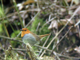 | 特徴 | 奈良県および愛媛県の県鳥。亜種コマドリは夏鳥として亜種タネコマドリは留鳥として,山地で繁殖します。雌雄とも頭部から胸,体上面はオレンジ色で,腹は白色です。亜種コマドリの雄では胸と腹の境界に黒褐色の帯が入ります。亜種タネコマドリではこの帯が目立たず,また,口角が黄色です。ヒンカララララ・・・とさえずり,これを馬のいななきと聞きなし,駒鳥の和名が付きました。ウグイス,オオルリと並ぶ日本三名鳥です。 |