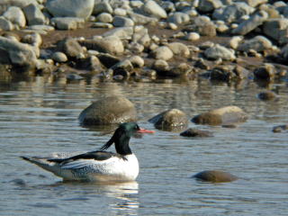 | 特徴 | 数少ない冬鳥として,河川や内陸部のダム湖などから記録されています。近年では記録が増え,九州を中心に毎冬国内のどこかで記録されている感があります。警戒心が強く,あまり岸には近づかないようです。雌雄ともカワアイサによく似ていますが,やや小型で,腰や脇腹,下尾筒などにあるうろこ模様がはっきり見えます。また,雌雄とも後頭部の冠羽はよく目立ちます。世界的な希少種で絶滅が心配されています。 |