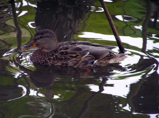 | 特徴 | 冬鳥として本州〜奄美大島で見られますが,夏には北海道や北日本の山地で繁殖します。雄の生殖(夏)羽では,黄色い嘴,緑色の頭部,白い首輪が特徴です。雌の生殖羽は地味ですが,嘴の大部分はオレンジ色で一部が黒色,次列風切(翼鏡)が青色です。雌雄とも脚(足)はオレンジ色です。アヒルは本種を家禽化したもので,さらにアヒルとの戻し交雑をしたものがいわゆる「アイガモ」です。 |