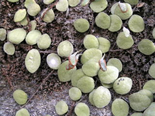 | コメント | 一見しただけではシダに見えない種。葉は円形から楕円形で肉厚,長さは1〜1.5cm程度です。胞子葉はへら形に近い形状になり,その柄は2cmに達することもあります。沖縄県産は葉が大型になり,変種リュウキュウマメヅタとされることもあります。 |