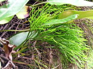 ・マツバラン科のシダは世界で2種おり,日本からはそのうち1種が分布しています。器官の分化ははっきりせず,現生のシダ類では最も原始的なグループとされています。多年生で常緑。暖地のものは樹幹上に,寒冷地のものは岩上に着生しています。