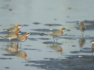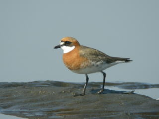 | 特徴 | 旅鳥として主に河口干潟や海岸に飛来するほか,一部は越冬します。生殖(=夏)羽では目先やのどを除いて頭部から胸にかけて橙色となり,首に黒線があります。非繁殖(=冬)羽では体上部が薄い茶色になります。嘴はチドリらしく太短く,嘴を根元で折り返したとき,本種は目の後端を越えません。 |