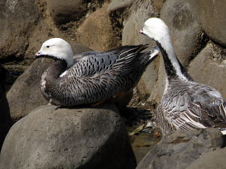 | 特徴 | 迷鳥としてただ一回,1964年〜65年の冬に宮城県から記録されています。北極圏で繁殖し,冬季はアリューシャン列島まで南下します。頭部から後頸にかけて白色で,脚は橙色です。宮城県で記録されたときはマガンの群中に一羽が混じっていたそうです。本来の分布域では主に海上で見られるそうです。 |