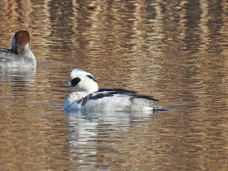 | 特徴 | 冬鳥として主に九州以北で見られます。北海道では一部が繁殖します。内陸の湖沼や河川で見られますが,沿岸にいることもあります。日本産アイサ類で最小で,水に浮いているときはかなり小さく見えます。雄の生殖(夏)羽は通称「パンダ鴨」で人気があります。雌の生殖羽は頭部からうなじが茶色,のどから頸にかけて白色です。雄のエクリプス(非繁殖羽)は雌に似ますが,目先は茶色で黒くは見えません。 |