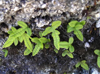 | コメント | 夏緑性の種。葉は一回〜複数回深裂しますが,おのおのの裂片の先端は鋭く尖らず,やや円みがあります。葉柄はみられず,葉身の長さは4〜25cm程度です。一部分を除き,葉脈はほとんどわかりません。胞子嚢群は円形で,縁よりは中肋に近い部分に形成されます。 |