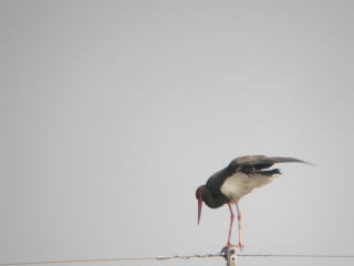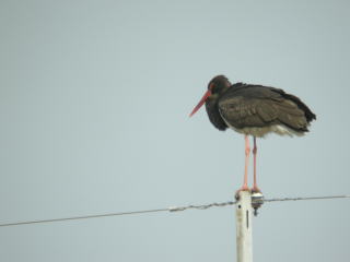 | 特徴 | 迷鳥として各地から記録がありますが,九州や沖縄からの記録が多いようです。英名の通り,頭部から胸,翼にかけて黒色で,腹は白,虹彩と嘴,脚は真紅です。比較的記録の多い幼鳥は体色がやや茶色みがかっており,嘴などの赤みに乏しいです。和名はすすけた鍋を思わせるコウノトリの意です。コウノトリと同様,樹上や電柱の上にいるシーンがよく観察されています。 |