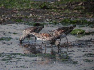 | 特徴 | 旅鳥として,主に海岸や干潟に渡来します。中型のシギで,首が短くて太っており,脚が黄緑〜黄色いことが見分けるポイントの一つです。嘴は黒く,まっすぐです。生殖(=夏)羽では頸を除き,体下面は白色,頸から上と体上面は黒色の部分が混じり,肩羽の赤褐色が目立ちます。 |