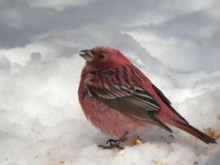 | 特徴 | 冬鳥として本州北〜中部で見られますが,数は概して多くはなく,渡来数も年によってさまざまです。多い年では西日本にも入ることがあります。成鳥の雄では全身が萩色(学名ではバラ色ですが)であり,非常に美しいです。頸と頭部は白色です。雌もかなり赤みを帯びてはいるものの,やや淡く,地の茶褐色が雄より目立ちます。他のマシコ類よりは山がちな場所を好み,林縁や道路沿いの草や小低木の実を食んでいる姿を見かけます。 |