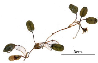 | コメント | 従来はウミヒルモ(広義)とされていた1種。葉身は全縁です。葉縁の幅が下部に行くにつれ細くなり,側脈が16〜22対とやや細かいのが特徴です。顕微鏡で観察すると葉縁にある透明な細胞層が基部では目立たないことも特徴の一つです。葉柄が紅色になります。 |
