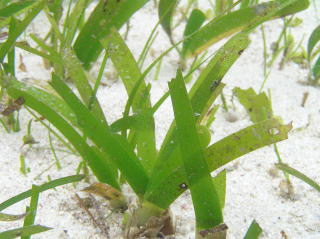 | コメント | 南西諸島では最も普通に見られる海草。幅広で長さ10cm程度になる葉は,鎌状に曲がって見えます。シュートの基部には古い(脱落した)葉鞘が残り,竹の皮のように見えます。地下茎の節の間隔が短いことも特徴です。 |