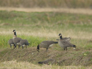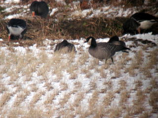 | 特徴 | 冬鳥として本州で見られますが,定期的な渡来地は限られています。北海道では旅鳥で,他の場所ではまれな冬鳥か迷鳥です。日本産のガン類では中型の種です。一般的な“ガン”の体形で,頭部から頸は黒色,胸より先は灰褐色です。頬と頸に白色部があります。通常はマガンの群れに数羽混じっている程度ですが,近年は個体数が増加しています。嘴は黒褐色,脚は黒色です。 |