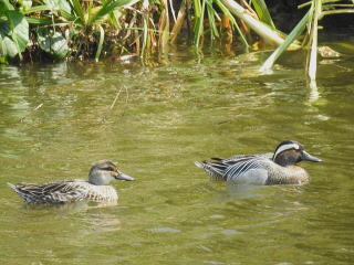 | 特徴 | 冬鳥として沖縄県南部で越冬するほか,旅鳥または迷鳥として全国で記録があります。雄生殖羽の頭部は茶褐色で白い模様が入ります。エクリプスや雌の生殖羽は地味でコガモに酷似しますが,眉斑は明瞭で,目先に淡い円が入ることがあります。エクリプスの記録がほとんどですが,野外でコガモと混同されていると思われます。翼鏡は緑色で灰色の雨覆が目立ちます。 |