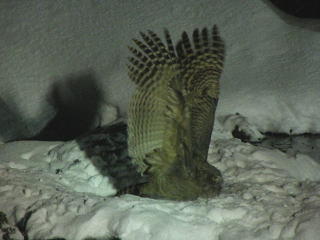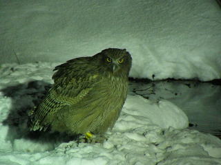 | 特徴 | 留鳥として,北海道中・北部の森林に棲息します。日本産フクロウ類では最大で,耳のように見える部分(羽角;うかく)は発達しています。虹彩は黄色。主食は英名の通り魚類で,河川で狩りをします。筆者の観察では,餌をとらえる時に翼を拡げることが多いようです(右の写真参照)。 |
