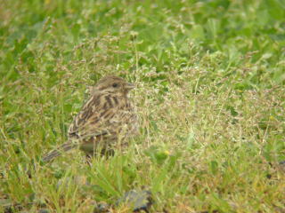 | 特徴 | 数少ない冬鳥または旅鳥として各地から記録があります。どちらかというと秋の渡りの記録が多いです。日本産の一般的なホオジロ類では大型の種で,他種と並ぶと大きさの違いが明瞭です。雄の頭頂付近は銀灰色で,頬の赤褐色と対比して目立ちます。雌の頭部は暗色で全体に地味です。雌雄とも胸や腰が赤褐色で,腰にはうろこ模様が入ります。一般に警戒心が強く,なかなか近寄らせてはくれません。 |