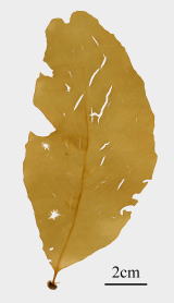 | コメント | 体は膜状になり,明瞭な主軸から,細い側枝が対生します。幼体時はまさにタバコの葉のようです。大型になると通常は裂けてきます。水中(生時)は栗色をしていますが,空気中に出すと硫酸イオンを出して緑色に変色します。 |