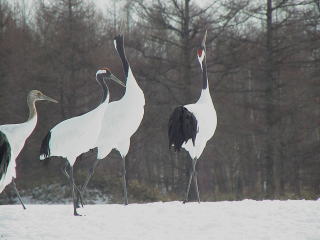 | 特徴 | 北海道の道鳥。留鳥として北海道の道東で見られますが,他の場所では迷鳥です。日本産ツル類では大型の種で,喉から頸,次列および三列風切が黒色であることが特徴です。かつては東京湾などでも越冬していたようですが,環境の悪化に伴い,一時期は絶滅が心配されましたが,現在では1000羽を越えるまでに回復しています。アイヌ語で「湿原の神」と称されます。 |