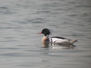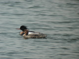 | 特徴 | 冬鳥として主に九州以北の沿岸で見られます。警戒心が強く,あまり岸には近づかないようです。雌雄ともカワアイサによく似ていますが,後頭部の冠羽は目立ちます。雄の生殖(夏)羽は頸下部が茶色で虹彩と嘴は赤いです。雌の生殖羽はカワアイサに似ますが,眼の周りが白く,頭部の茶色と白色の部分の境界は不明瞭です。雄のエクリプス(非繁殖羽)は雌に似ます。 |