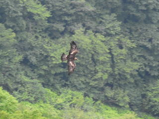 | 特徴 | 石川県の県鳥。留鳥として九州以北の深山で見られますが,個体数は多くありません。ほぼ全身が黒褐色ですが,後頸が金褐色で英名の由来となっています。幼鳥は成鳥よりも黒っぽく,風切と尾に白斑があり「三ツ星タカ」などと呼ばれています。日本の猛禽類では最大級で,時にノウサギやニホンザルも襲って食べるようです。このことから天狗のモデルではないかという説もあります。 |
